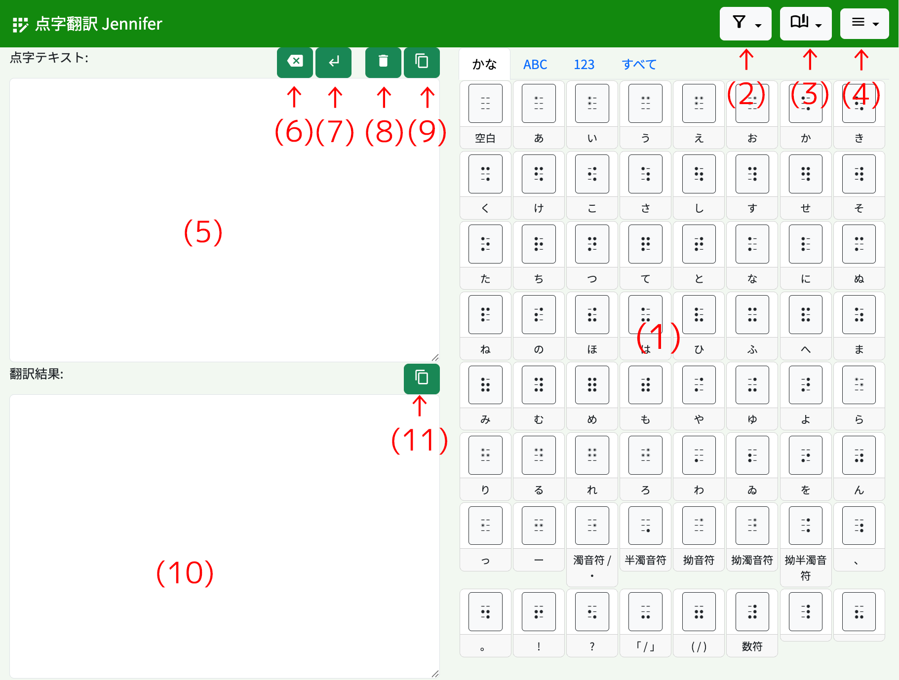 - (5) → ここに入力した点字テキストが翻訳されて(4)に表示されます。最大文字数は1000文字です。